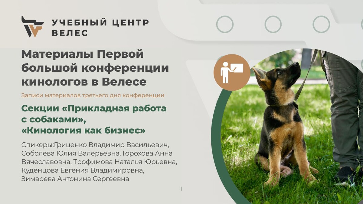 Материалы третьего дня конференции в Велесе в секции «Прикладная работа с собаками», «Кинология как бизнес». 7 уроков в записи с презентациями материалов.